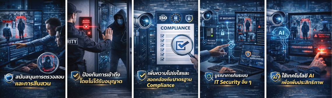 เมื่อเกิดเหตุการณ์ผิดปกติ ระบบบันทึกภาพสามารถใช้เป็นหลักฐานเพื่อวิเคราะห์เหตุการณ์ ยืนยันตัวบุคคล และตรวจสอบเส้นทางการเข้าถึงระบบ - บูรณาการกับระบบ IT Security อื่น ๆ